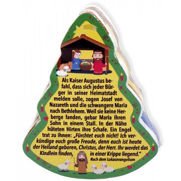In Form gepresstes Handtuch aus 100% Baumwolle, ca. 30x30 cm. Auf der Verpackung ist die Weihnachtsgeschichte aufgedruckt.