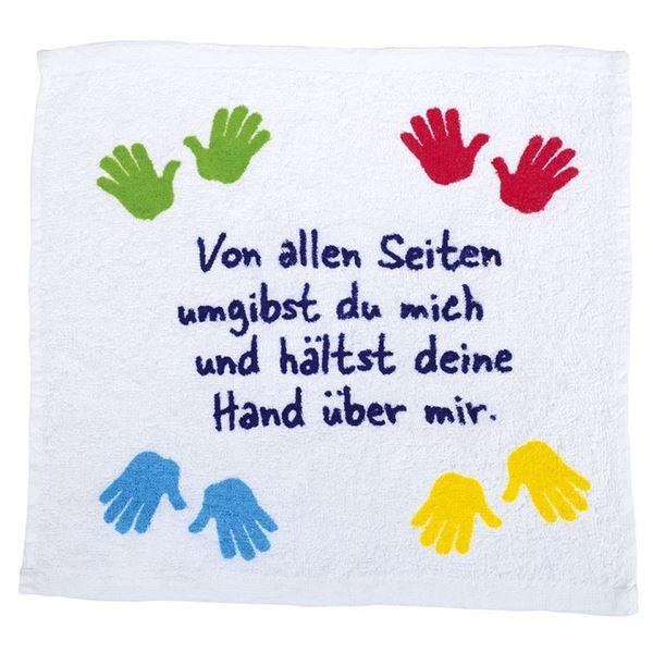 Kleines Handtuch gepresst in Händchen-Form. Entfaltet sich in warmen Wasser und der Text "Von allen Seiten umgibst du mich und hältst deine Hand über mir." wird sichtbar.