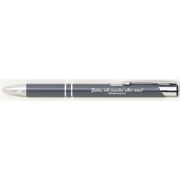 Ergonomisch geformter Kugelschreiber mit der Jahreslosung 2026. Silberfarbener Schaft, farbige Griffzone aus Kunststoff.