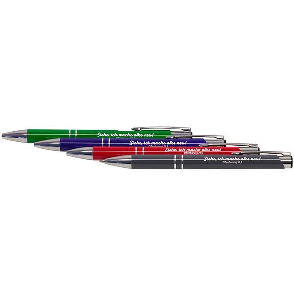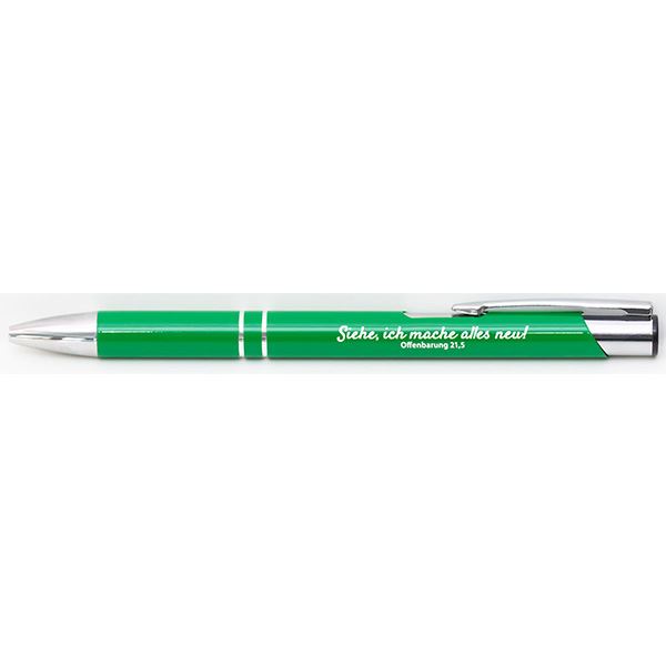 Ergonomisch geformter Kugelschreiber mit der Jahreslosung 2026. Silberfarbener Schaft, farbige Griffzone aus Kunststoff.
